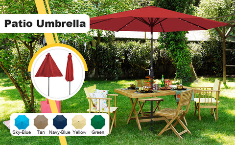 - LED Patio Umbrella: 32 LED lights powered by the solar panel located on the top of the umbrella.The umbrella lights at night are perfect for dining outside or just sitting an relaxing.The light switch is on the center pole