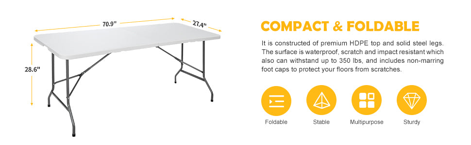 - Sturdy Construction -- It is constructed of premium HDPE top and solid steel legs .The surface is waterproof, scratch and impact resistant which also can withstand up to 350 lbs, and includes non-marring foot caps to protect your floors from scratches