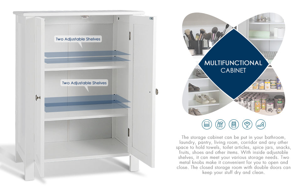 - 【Multifunctional Cabinet】The storage cabinet can be put in your bathroom, laundry, pantry, living room, corridor and any other space to hold towels, toilet articles, spice jars, snacks, fruits, shoes and other items. With inside adjustable shelves, it can meet your various storage needs. Two metal knobs make it convenient for you to open and close. The closed storage room with double doors can keep your stuff dry and clean.