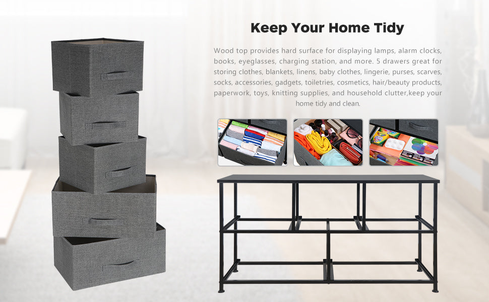 - 【Keep Your Home Tidy】 — Wood top provides hard surface for displaying lamps, alarm clocks, books, eyeglasses, charging station, and more. 5 drawers great for storing clothes, blankets, linens, baby clothes, lingerie, purses, scarves, socks, accessories, gadgets, toiletries, cosmetics, hair/beauty products, paperwork, toys, knitting supplies, and household clutter,keep your home tidy and clean.