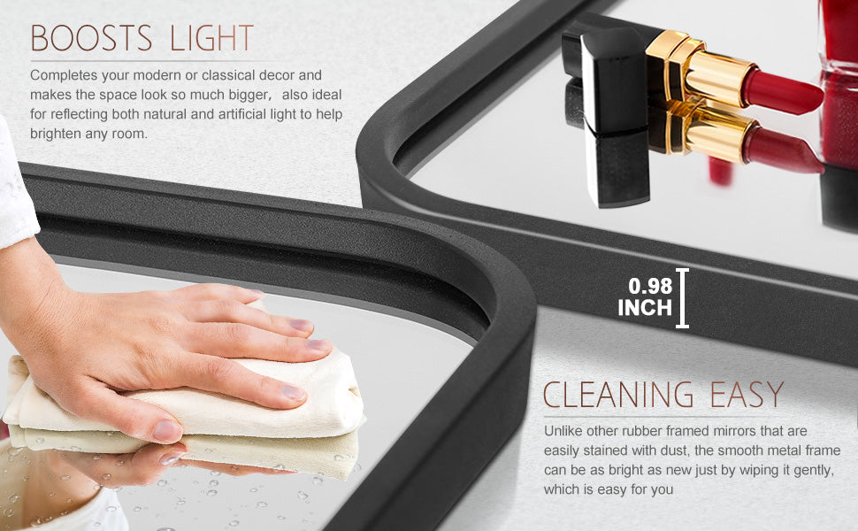 Cleaning Easy -- Unlike other rubber framed mirrors that are easily stained with dust, the smooth metal frame can be as bright as new just by wiping it gently, which is easy for you