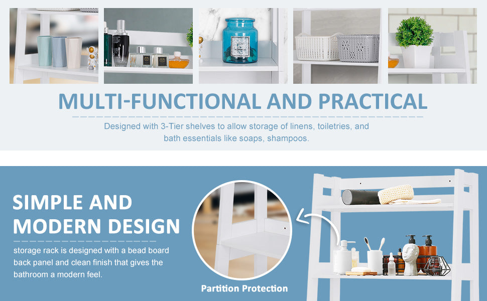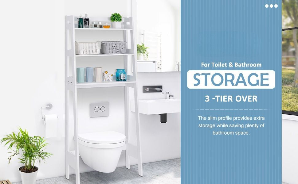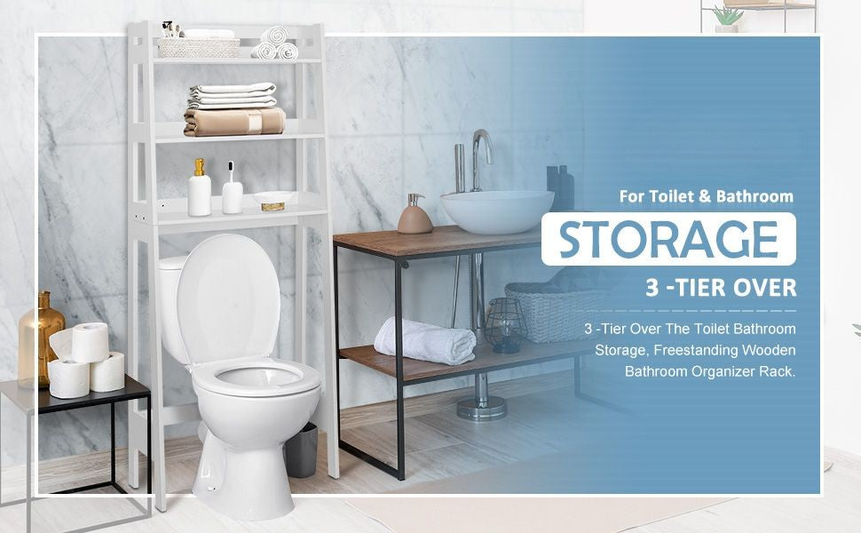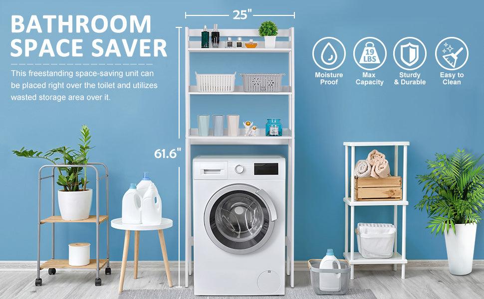 - This wooden over toilet storage has the solid white covering that gives it a smooth, easy-to-clean finish for years of use with the proper care, and premium particle board construction adds its durability and stability. High toughness, difficult deformation, weight capacity up to 19lbs. Paint white finish, water proof