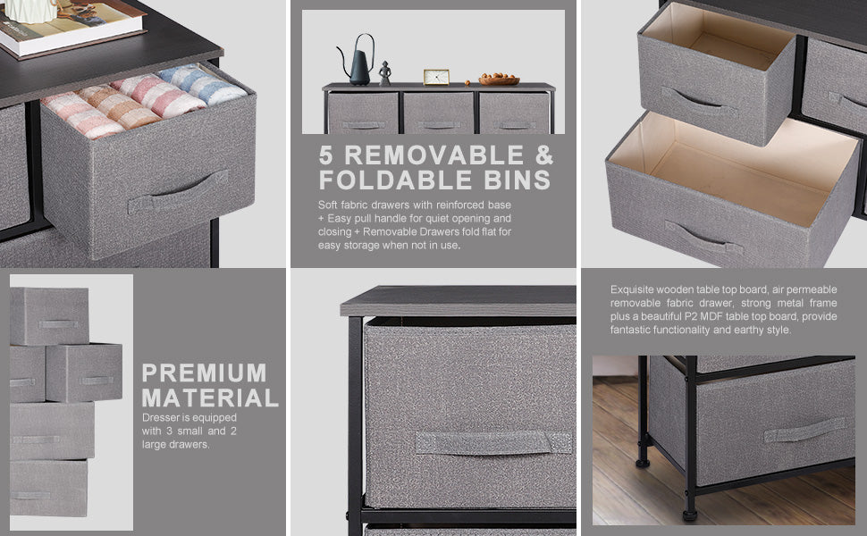 - 5 REMOVABLE & FOLDABLE BINS: Soft fabric drawers with reinforced base + Easy pull handle for quiet opening and closing + Removable Drawers fold flat for easy storage when not in use, the entire unit is portable, lightweight, and easy to relocate to different spaces Use in or out of the closet and keep clutter under control by storing all of your clothing and accessories in one convenient place