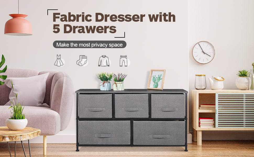 - DETAILS THAT MATTER: Dresser is equipped with 3 small and 2 large drawers. Adjustable levelers ensure stability on uneven surfaces. Water-based finish that meets stringent chemical emission standards. Plastic feet will not scratch flooring, and they are adjustable for uneven surfaces. Product size: 39.4 * 11.8 * 21.4in; Small drawers measures: 11.8*10.8*8.5in; Large drawers measures: 18.1*10.8*8.5in