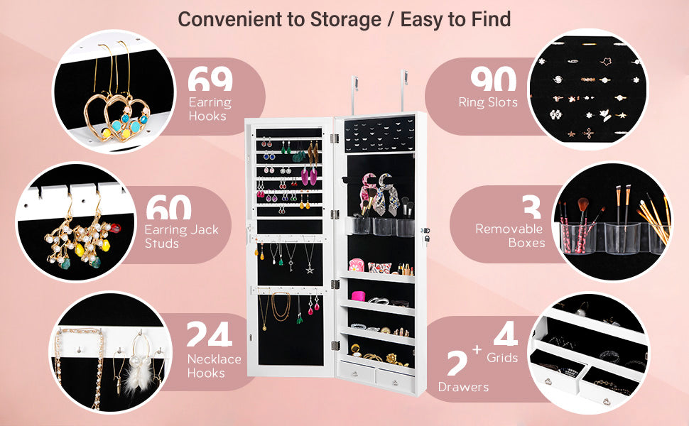 - LARGE STORAGE SPACE -- ZENY™ jewelry cabinet mirror has spacious storage capacity and is suitable for all types of jewelries. 24 necklace hooks,4 bracelet rods, 2 drawers, 60 slots & 69 stud holes for earrings, 90 ring slots, 3 makeup tool cups. Devided space and organizers makes your jewelry easy to find.