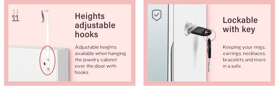 Adjustable heights available when hanging the jewelry cabinet over the door with hooks.