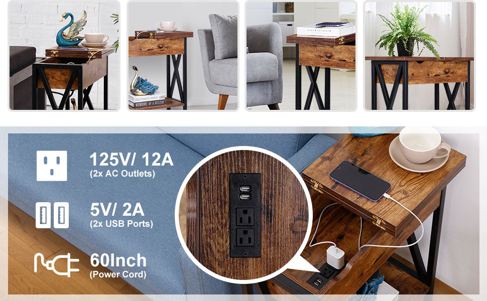 【End Table with Charging Station】The built-in charging station includes 2 standard outlets and 3 USB ports, even included a 60 inch long electrical cord that can easily charge your phone, tablet, and even your laptop. When the charging cords are not in use, you can take them into the interior compartments and shut the top lid, making it look very neat and well-finished