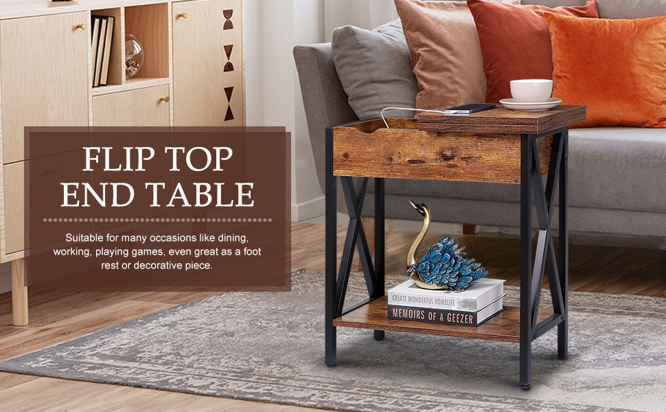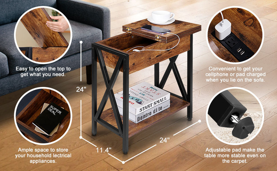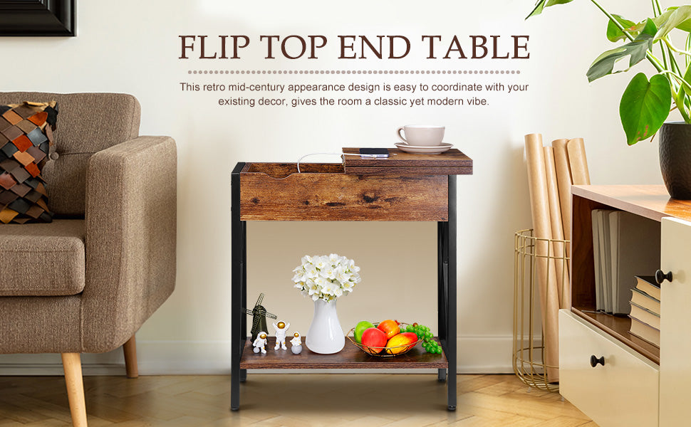 End Table with Charging Station Narrow Sofa Side Table Flip Top Accent Nightstand with USB Ports and Outlets Retro Industrial for Bedroom, Living Room, Metal Frame, Rustic Brown