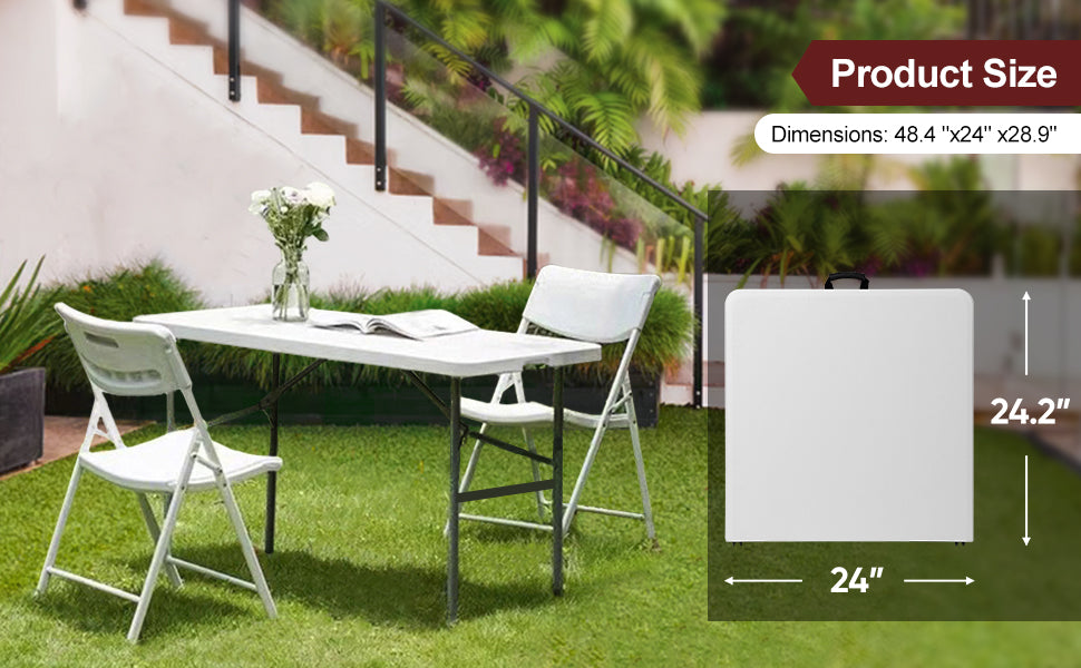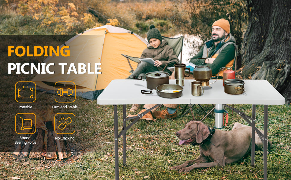 【Sturdy & Stable Construction】- Powder-coated steel frame and HDPE material table top provides this table superior strength and durability. Locking mechanism and non-slip rubber feet help to keep the table in place.