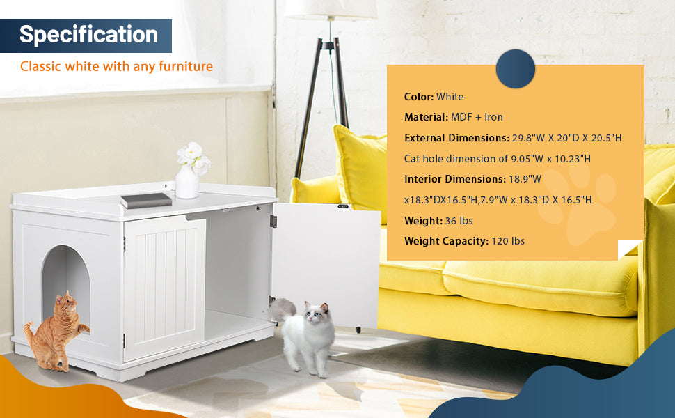 - Multi-functional: The pet furniture serves as nightstand,side table,end table, storage beach, decorative cat litter box enclosure or cat house. With wide table top allows you to place lamp, books, magazines, potted plants, drinking cups etc. In addition, classic white color will perfect matches any other home furniture in your room, especially suitable for the living room, hallway, bathroom, laundry room, etc.