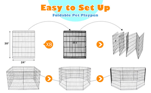 - 【Large Safe Space for Your Pets】-- 24"W x 30"H of each panel. This interactive and expandable pet playpen for small pets provides large enclosed area for pets, ensuring that they have enough room for play and exercise. Our puppy playpen keeps your pets safe from others and the sides of dog playpen are tall enough for a small child to reach into the enclosure.