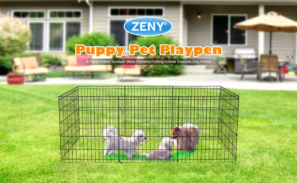 - 【Sturdy and Durable Dog Fence】-- ZENY dog playpen was made of solid wire construction,8 panels (each panel 24'' W x 30'' H) dog fence includes 4 ground stakes, 3 secure locking thumb snaps & can be used in conjunction to hold firmly to the ground while being used outdoors. And this pet playpen is ideal for small to middle pets.