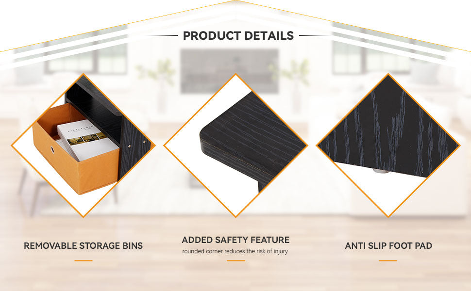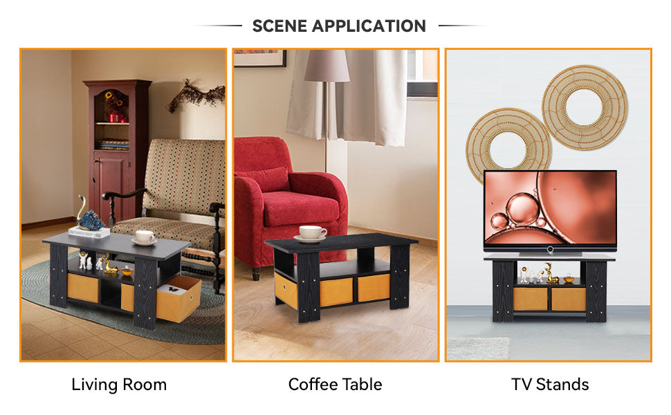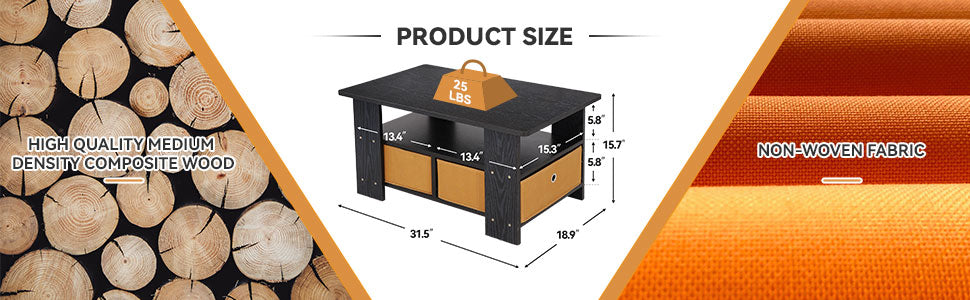 - 【Larger Desktop and 3-Tier Design】-- Our coffee table with the large tabletop and lower open shelf are better for storing snacks, magazines and books, remote, etc; 2 non-woven fabric bin drawers expand your available storage space and keep all your things handy and organized.