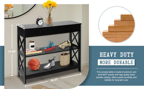 【Versatile Use with Drawer & Shelves】Elegant yet Practical! 3-Tier design(2 shelves and 1 drawer) provides a lot of storage and display space; The drawer is perfect for holding small stuff like keys or household gadgets. Perfect choice for entryway, hallway, living room, bedroom, office and more places as a console table, display table, sofa side table, bookshelf etc