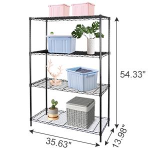 - 【Durable & Stable】- 4-tiers of shelving made of strong steel with black-coated chrome finish. Each shelf holds up to 66 lbs, total max load weight is 265 lbs (evenly distributed), this shelf is durable and resistant to dirt buildup.