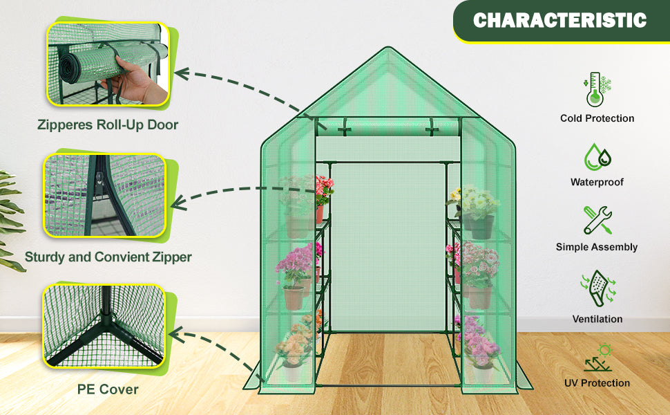 ZENY Mini Walk-in Greenhouse is perfect for gardening enthusiasts looking for a way to grow plants and flowers all year round. The green color PE cover retains solar energy and protects seedlings from frost or pests, allowing your plants to grow with out stress. The spacious design is equipped with 8 wired shelves, 4 located on each side, providing ample room for plant storage. You can easily walk in through the zippered door which can be rolled up, and move freely to cater for your plants. Durable high-grade metal frame with guy ropes and stakes support its stability for harsh weather conditions. This mini greenhouse is ideal for balcony, deck, or patio and can be easily dismantled to transport to another location.